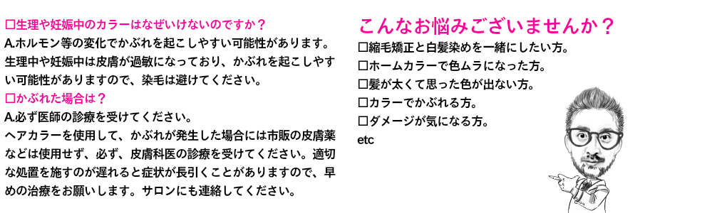 カラーはサロンで一番ダメージを気にする「技術」になります。塗布量、塗布時間、温度、放置時間、流し、定着などめちゃめちゃ気を使います。特に「縮毛矯正」や「デジタルパーマ」を施術された方にはご利用してほしいです。なるべくなら「ホームカラー」はさけてほしい…やむなくする場合は「クリームタイプ」で「部分染め」のみでお願いいます。ご希望であればサロンにてお尋ねください。
