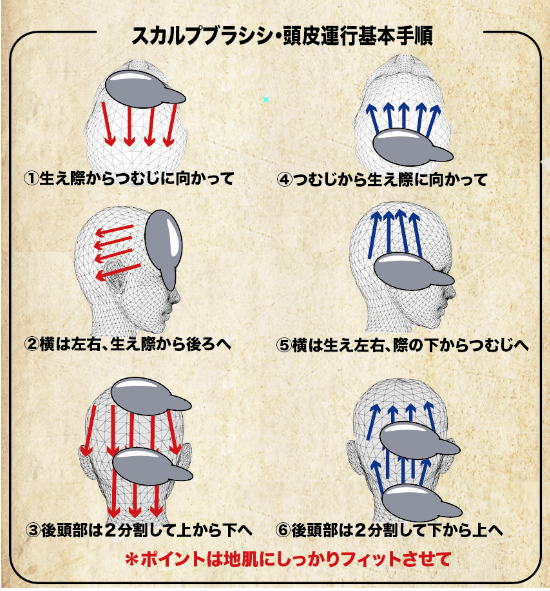 3.生え際から地肌に沿うってつむじに向かって一方通行。